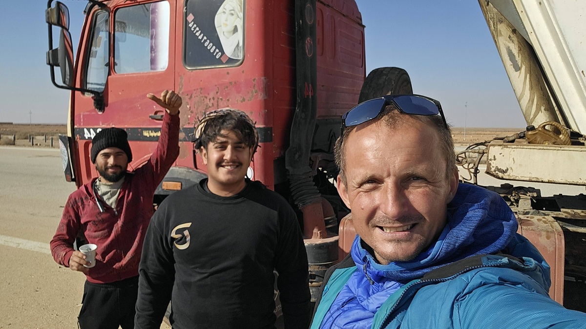 Од поднева сам добио пратњу. На сваких десет километара су се смењивали у наредних 40 километара. Од једног војника на поклон добијам фантомку и рукавице. Много је хладно било. Стижемо на раскршће, на огроман контролни пункт. Као да смо на граници. Сваког проверавају, било је баш живо и прометно, мада ту се укључивала и једна саобраћајница из Саудијске Арабије. Задржао сам се добрих пола сата ту. Добродошло ми је да одморим.